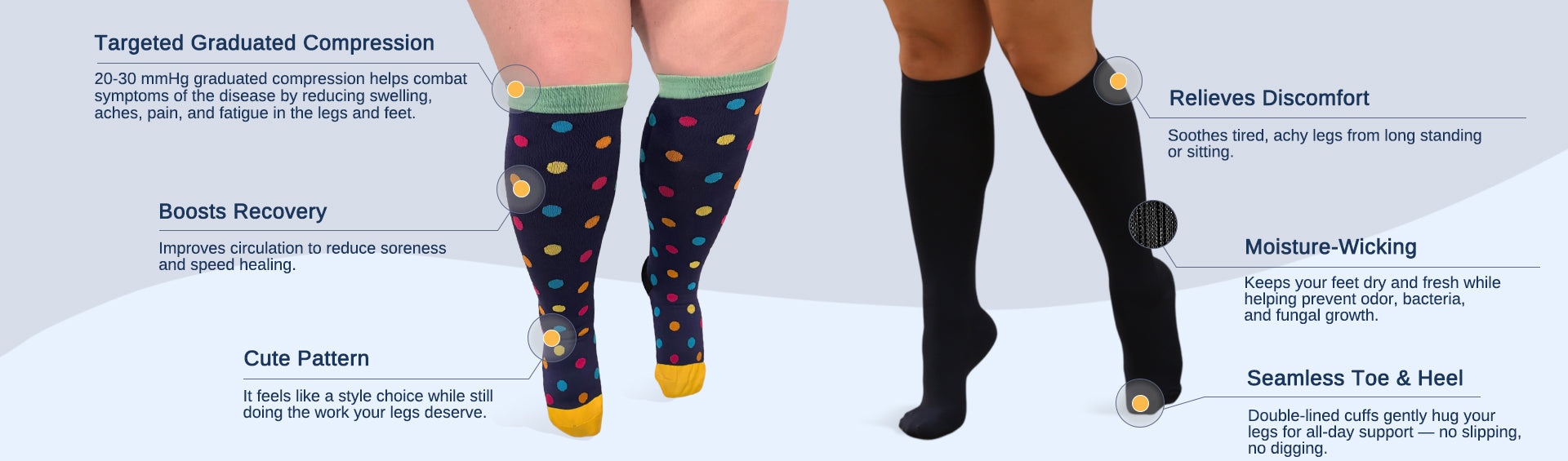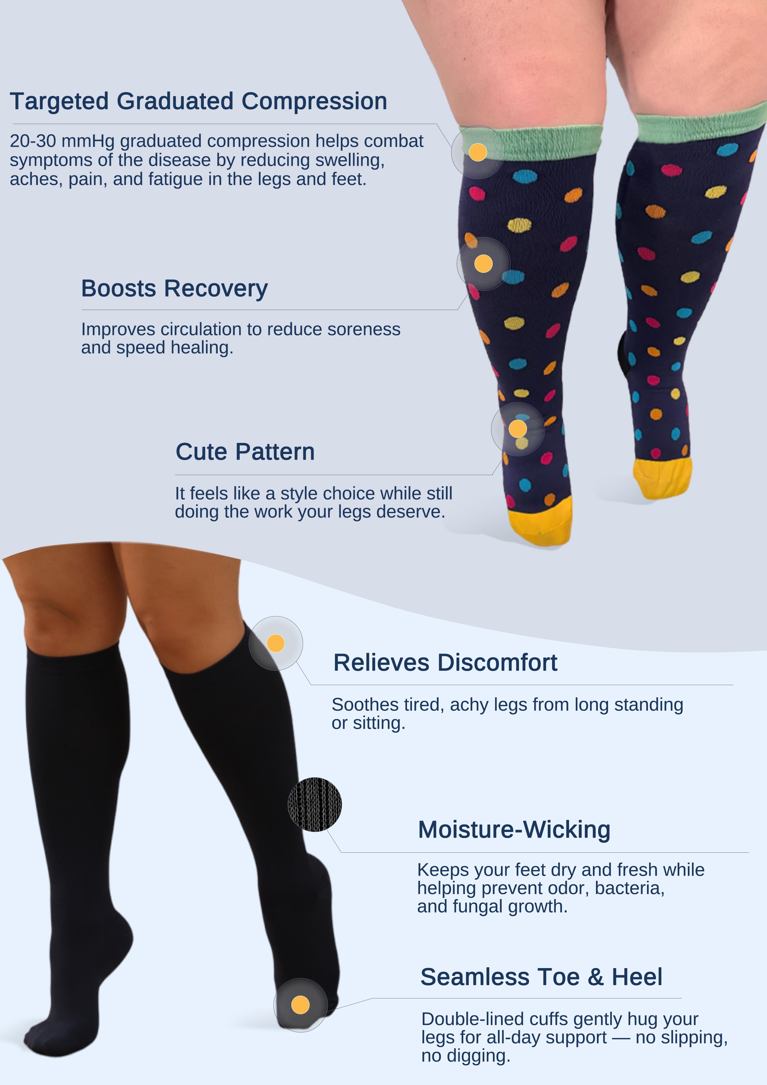“I absolutely love these compression socks!!! These are the best, most affordable socks I've ever had. I naturally have wide calves and for years I've worn compression socks due to edema. The right ones really do make a difference...not only in comfort, but also in reducing swelling / helping with circulation.”——Lisa