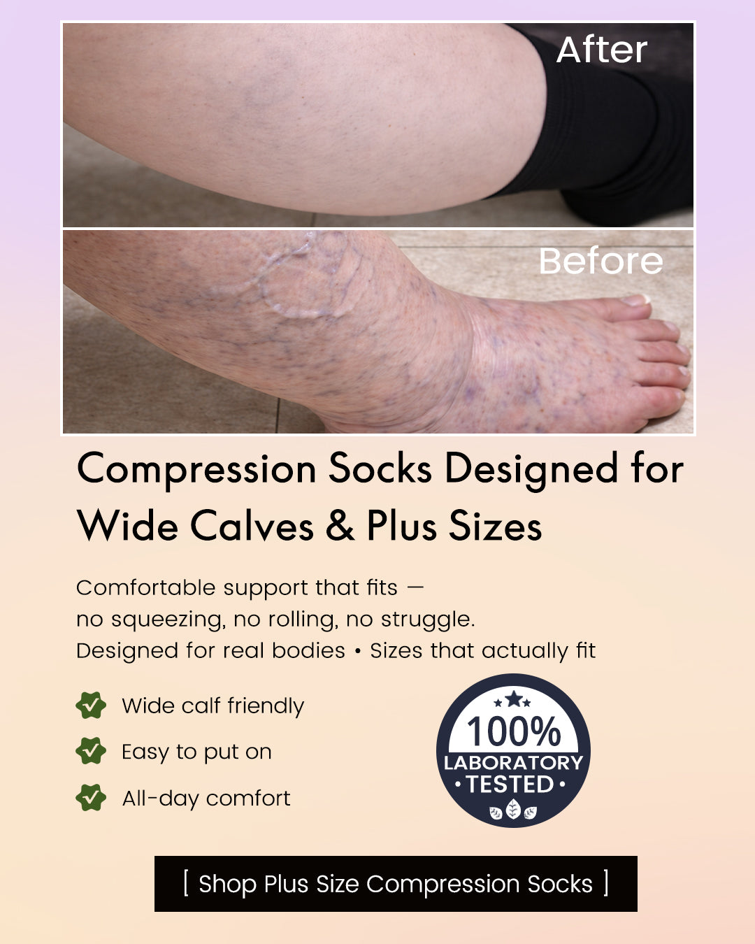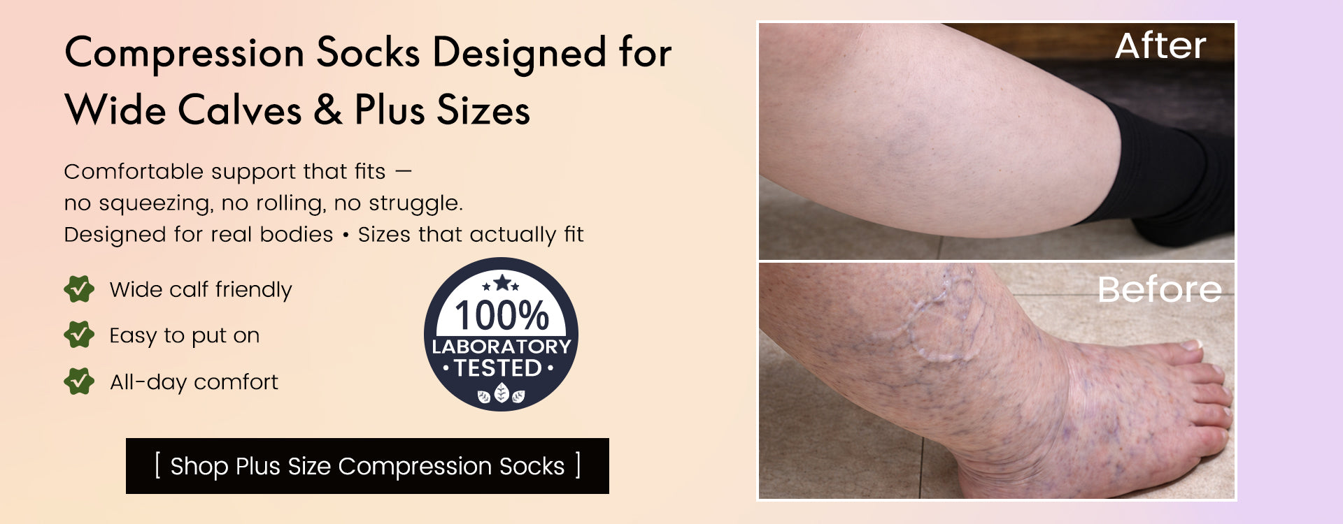 "These wide-calf compression socks are amazing! They go on easily and don't cut off my blood supply... even when I forgot and wore them for 20 hours straight. I've only washed them twice, but they still look and feel like new. I'm going to order more because I want to wear them every day."——Stephanie