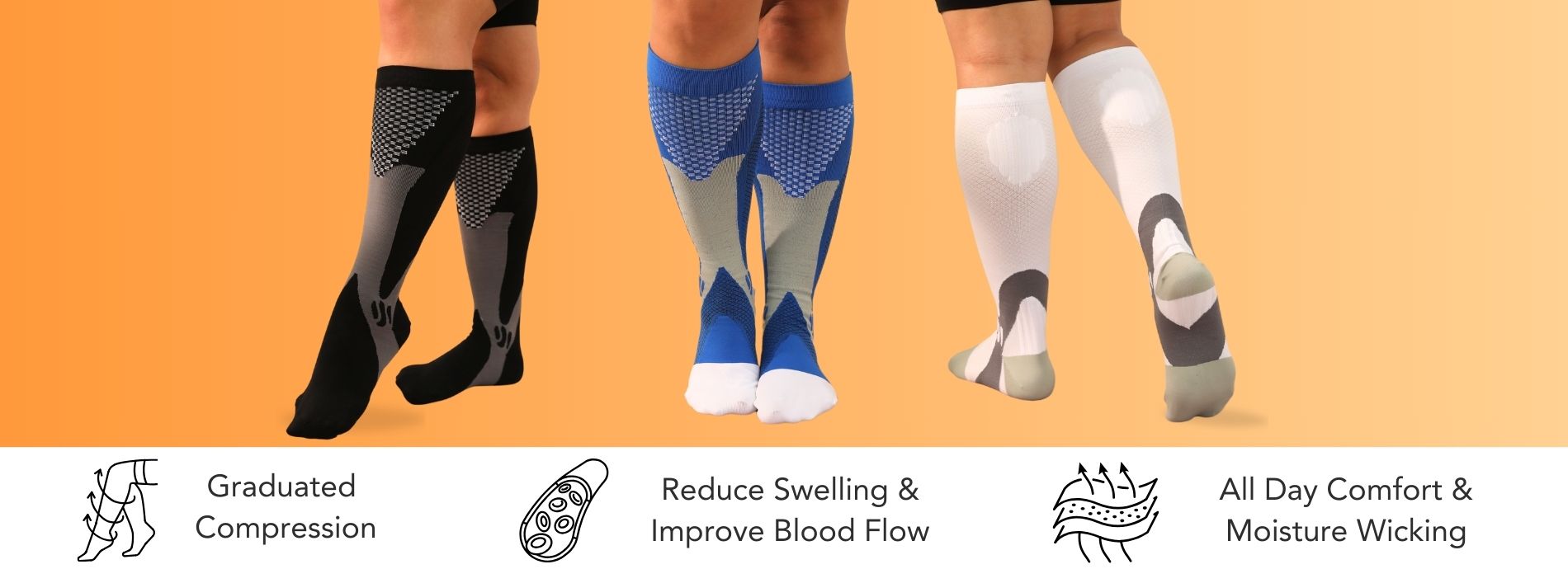 Plus size compression socks are designed for those who seek both comfort and functionality in larger sizes. Both womens plus size compression socks and men's.These socks are beneficial across various needs, providing essential support, enhancing blood circulation, and mitigating swelling. Let’s explore the individuals who stand to gain from plus size compression socks: