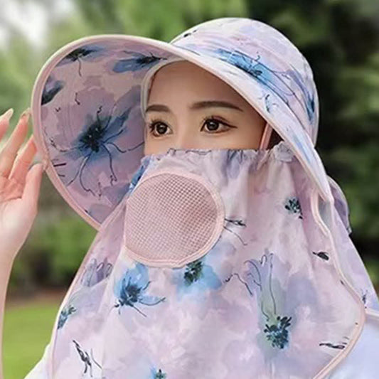 Plusock Rose Print Large Brim Shawl Mask Sun Hat