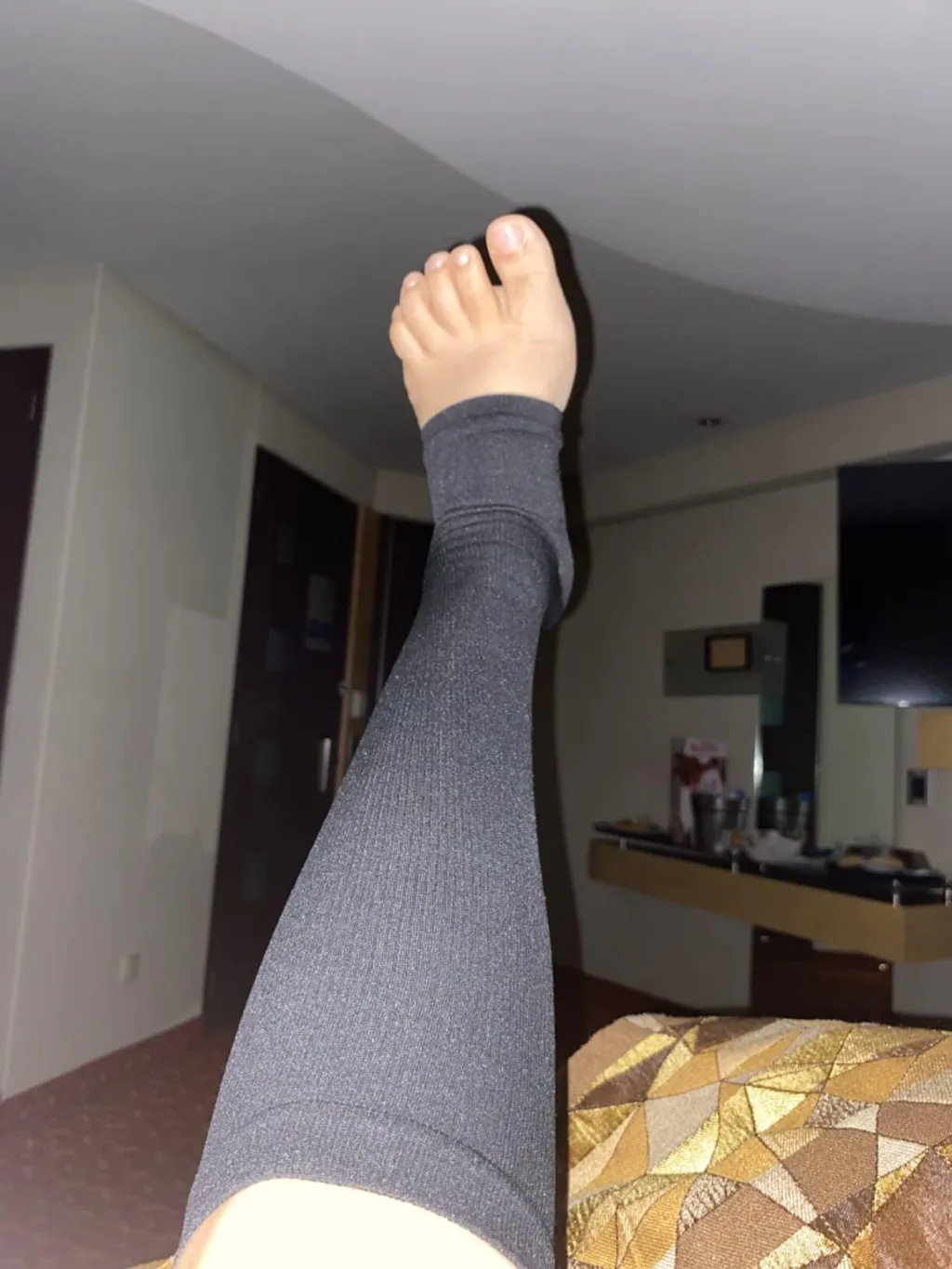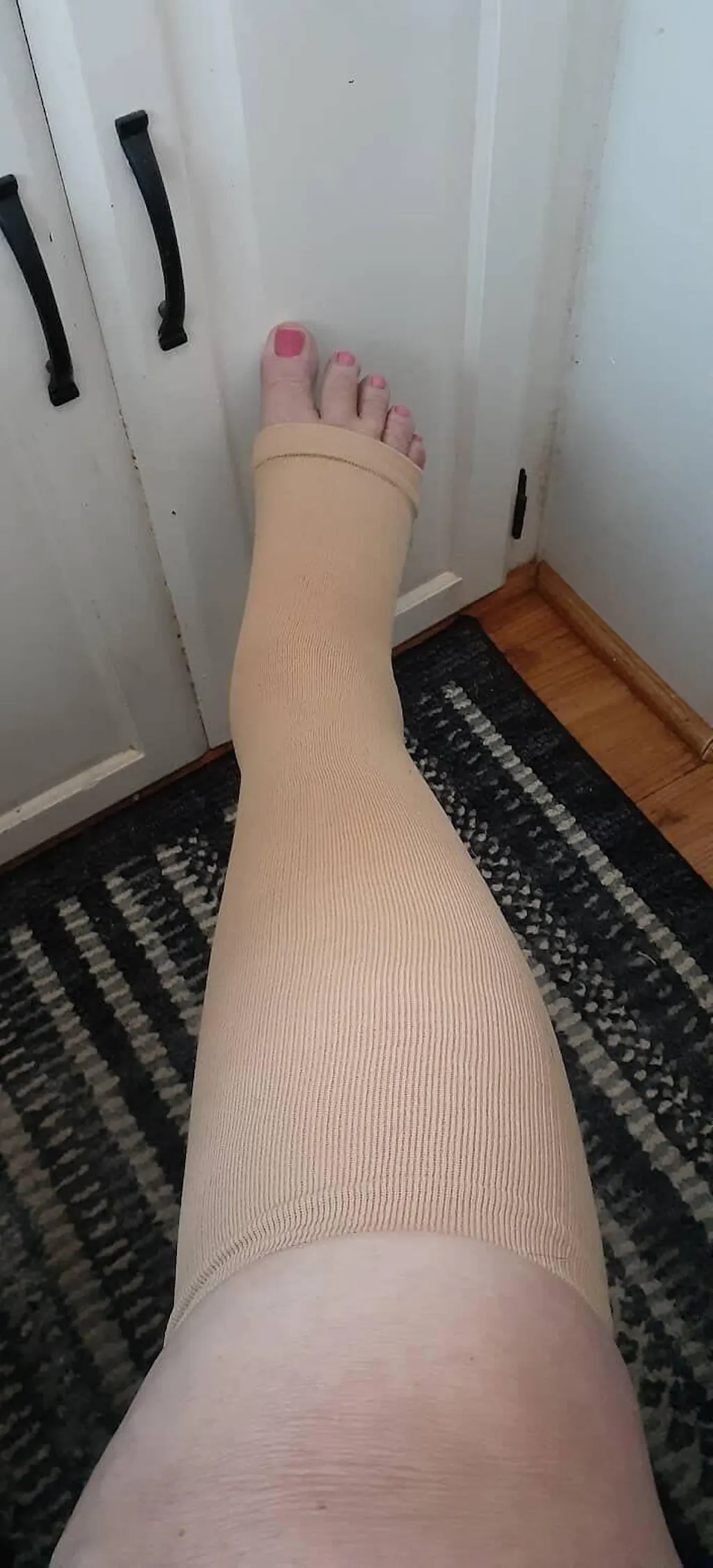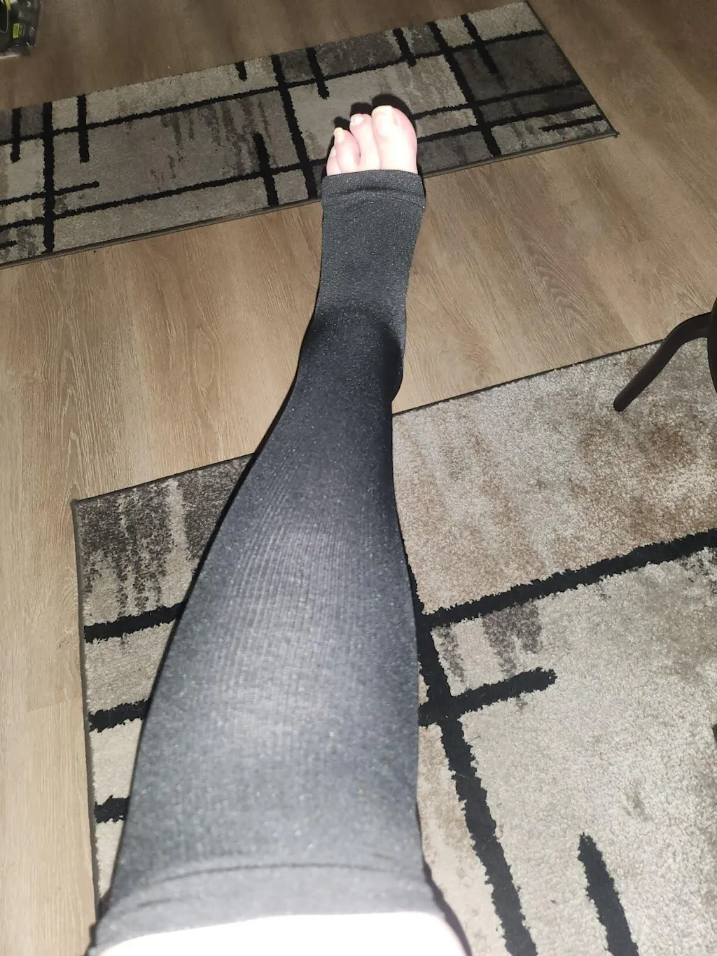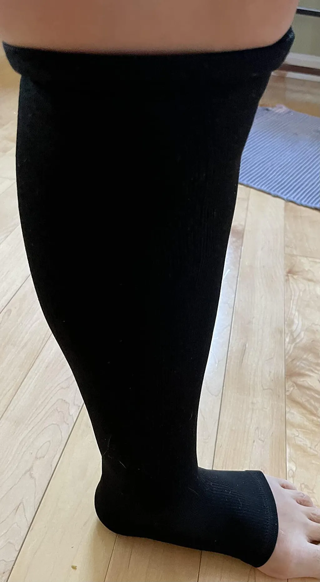 Love my black open-toe compression stockings. They are lower compression so I'm able to leave on longer without being as painful after a couple of hours, and they are so much easier to get on.